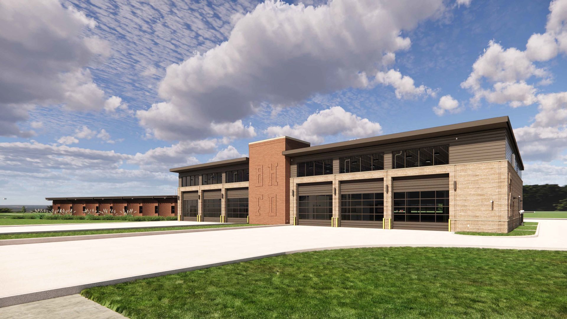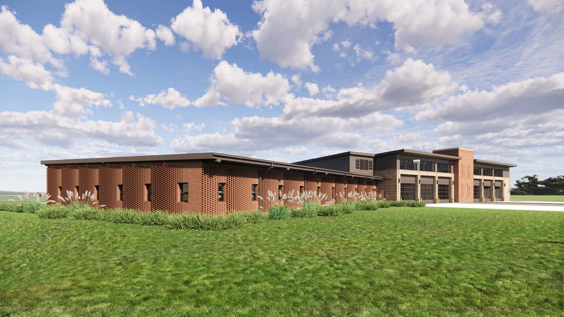 Operational efficiency and firefighter wellness were central to the design. The facility includes proper dorm rooms for crew members and ample double pull-through apparatus bays to support quick, efficient response times. Because the site fronts a busy roadway, the design carefully balances privacy with access to natural light and fresh air. Crew living and support spaces are located toward the rear of the building, providing a quieter environment for rest, decompression, and recovery.