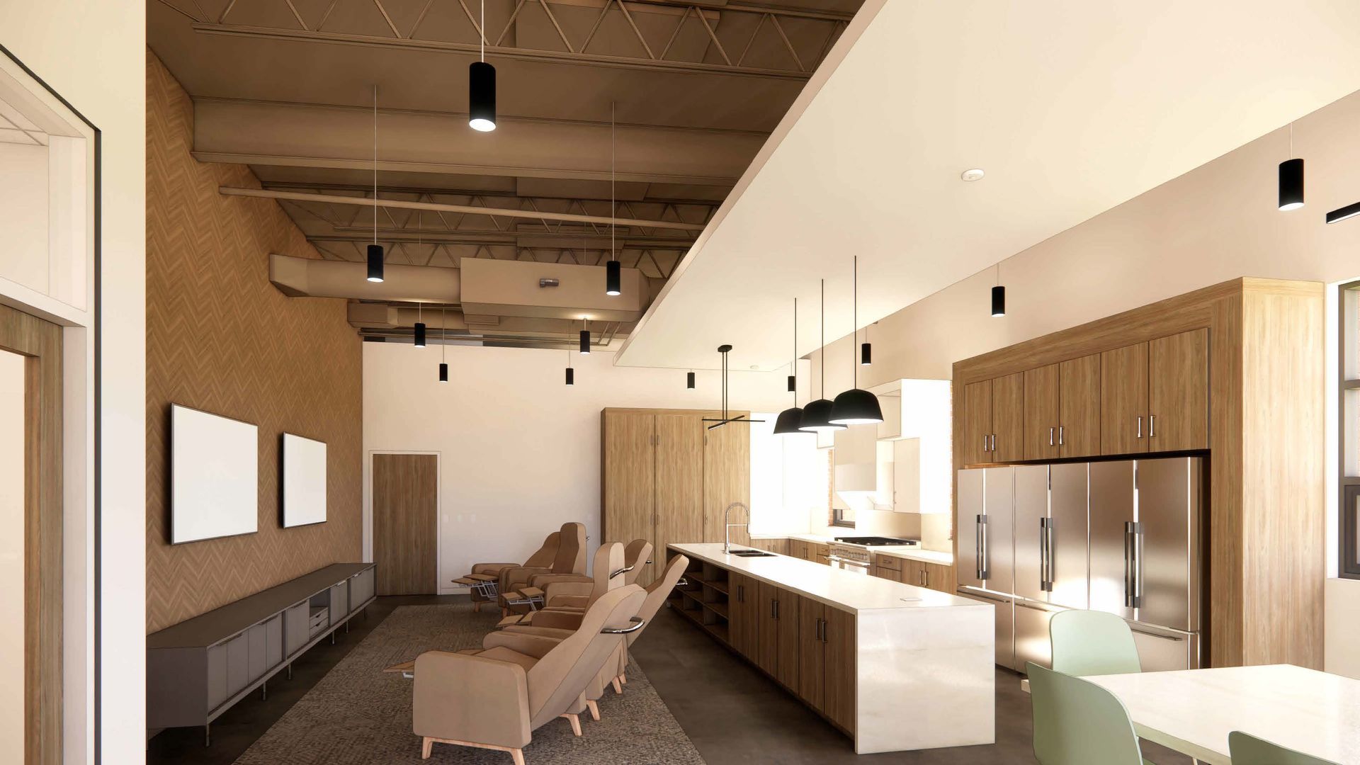 Decontamination areas, gear storage, and equipment maintenance spaces were strategically centralized within the apparatus bay to allow immediate access while minimizing the risk of cross-contamination. A mezzanine level above these spaces provides generous storage capacity and integrated training features, enhancing the building’s long-term flexibility and functionality.